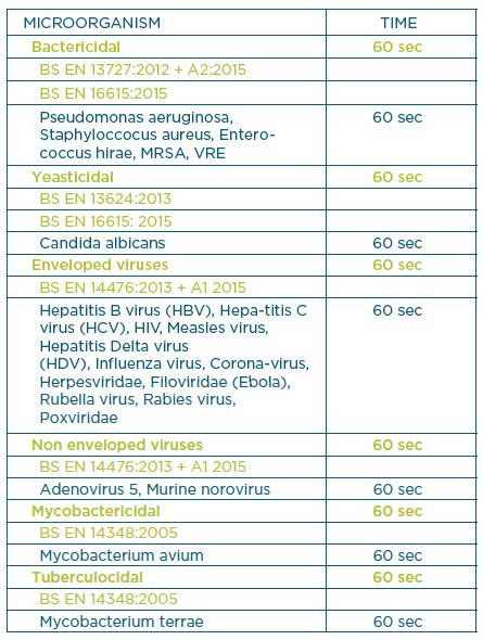 Tiêu Chuẩn Kiểm Nghiệm: The following test standards have been achieved: EN 14885, EN 14476, EN 14348, EN 13727, EN 13624.