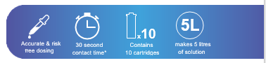 Virofex ECO-CARTRIDDE, mỗi hộp có 10 ống x 8ml tương ứng với 5 lít dung dịch khử trùng được pha loãng 10 lần/ 10 ống. Mặt sau của hộp có màng keo được thiết kế để dán lên tường hoặc móc ngay khu vực đó. Dễ bảo quản, không chiếm diện tích phòng khám.